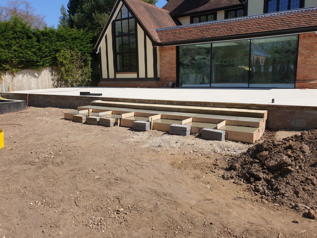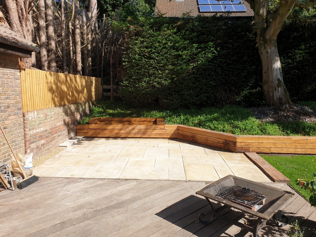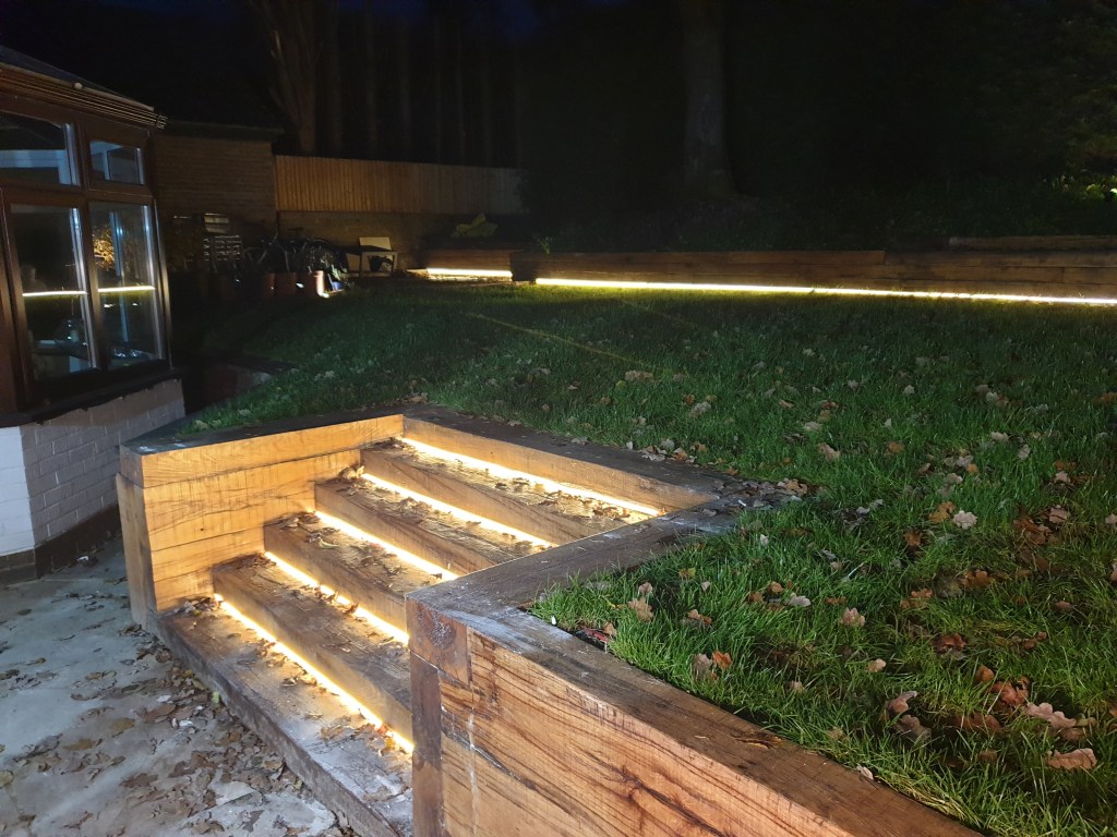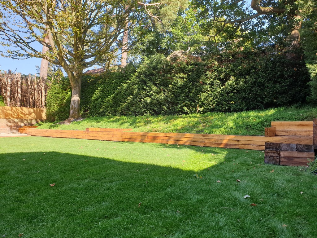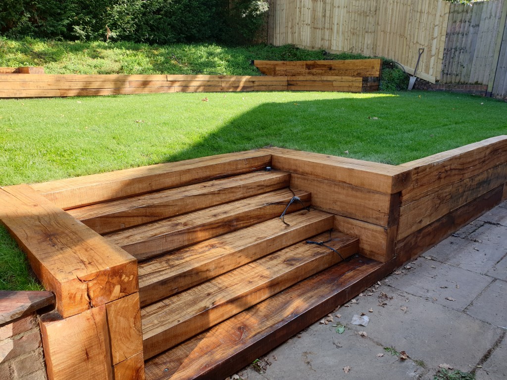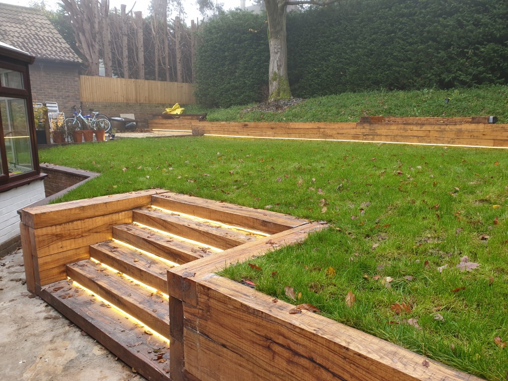 Ascot-landscaping, new garden design, stone patio, oak railway slippers walls and stairs, turfing and led lighting