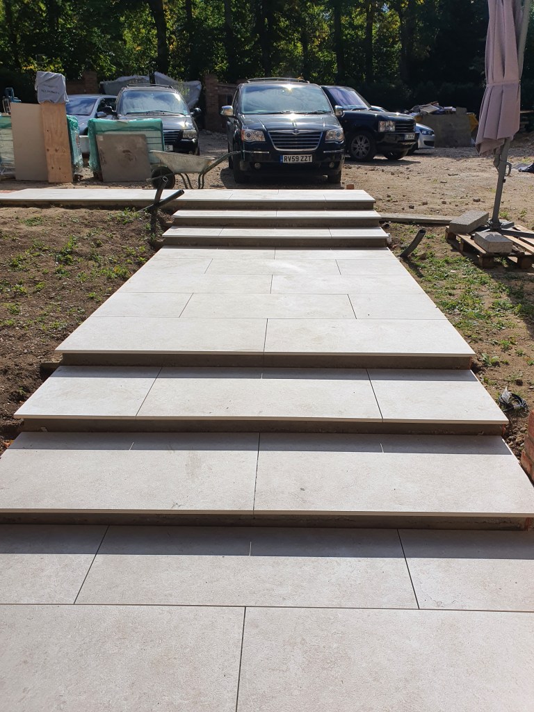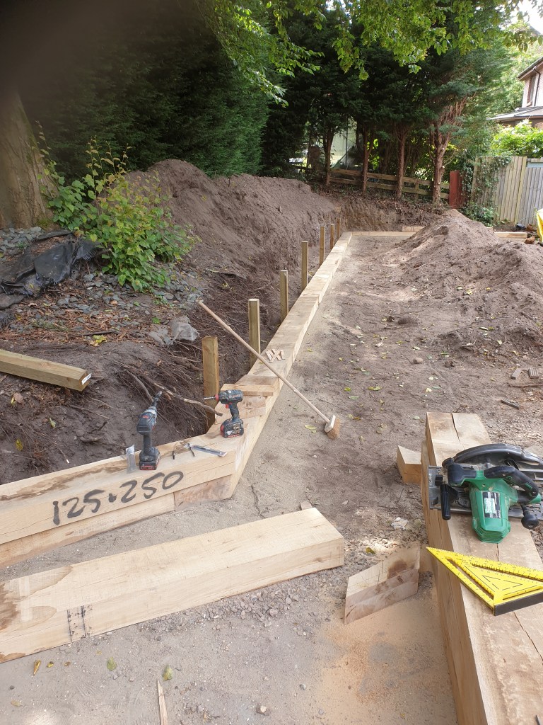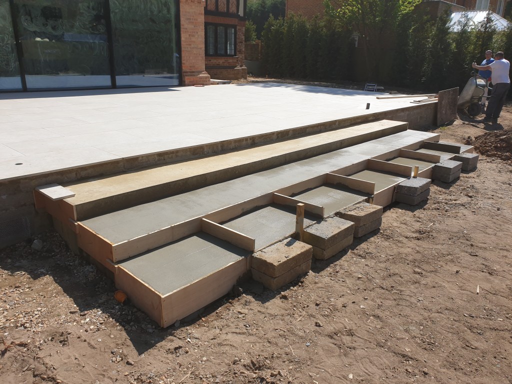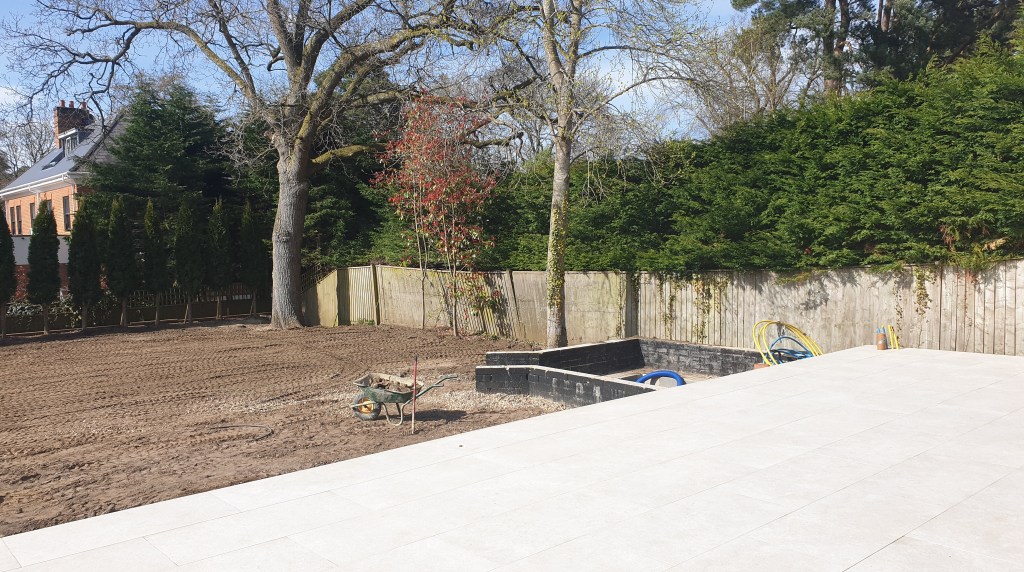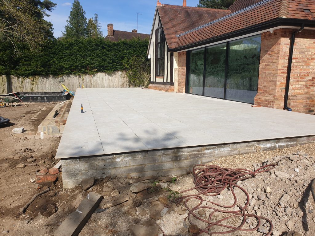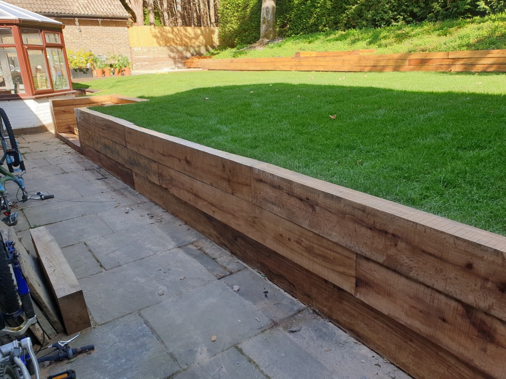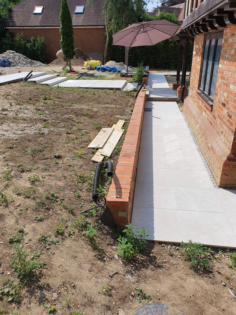 Ascot-landscaping, new garden design, stone patio, oak railway slippers walls and stairs, turfing and led lighting