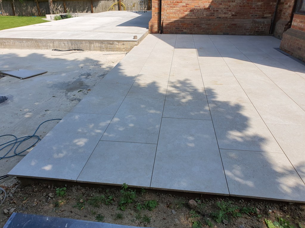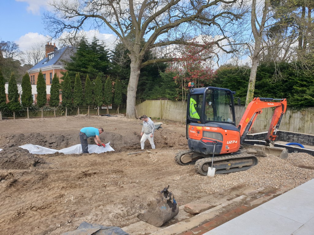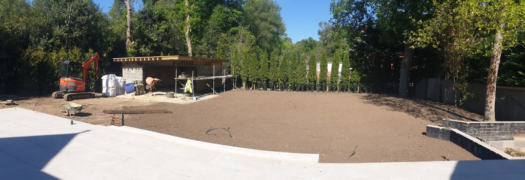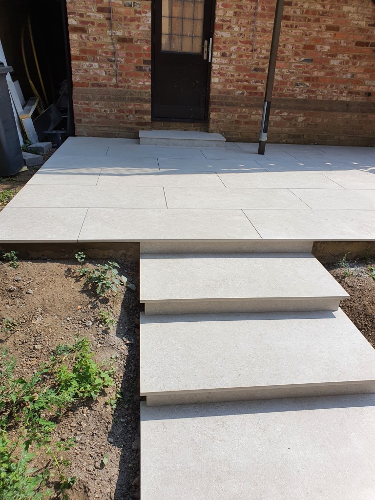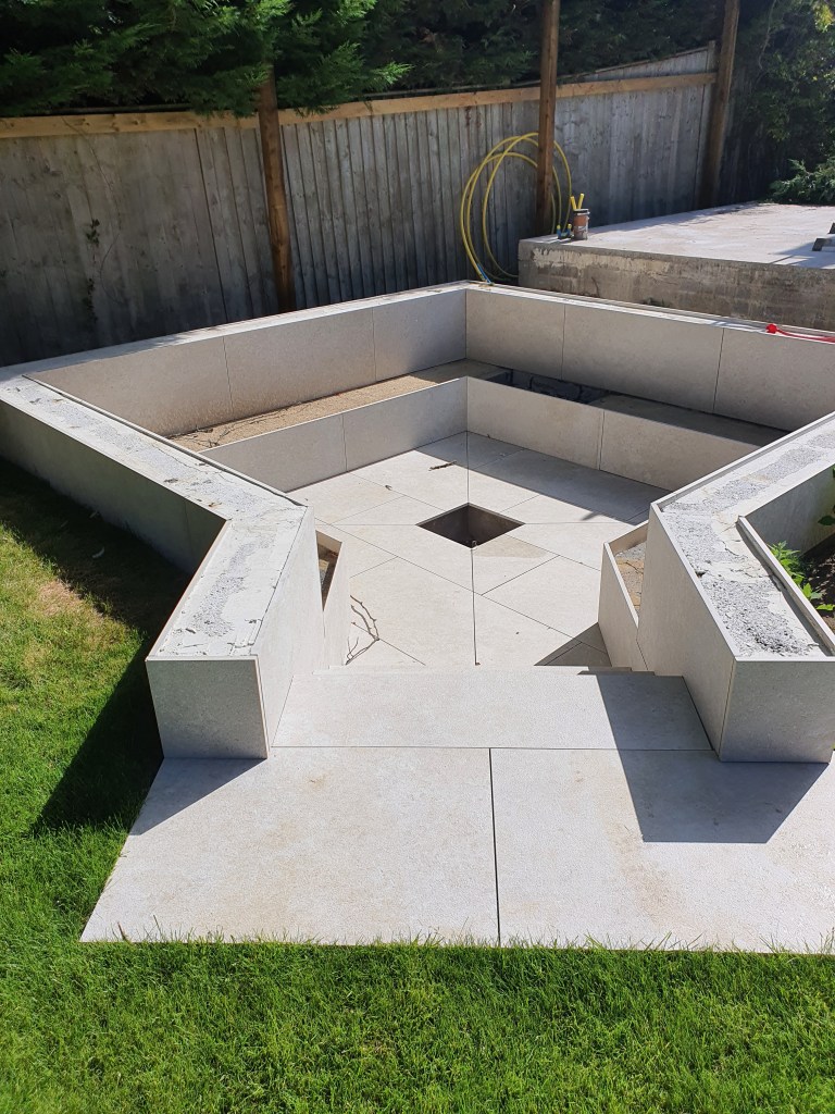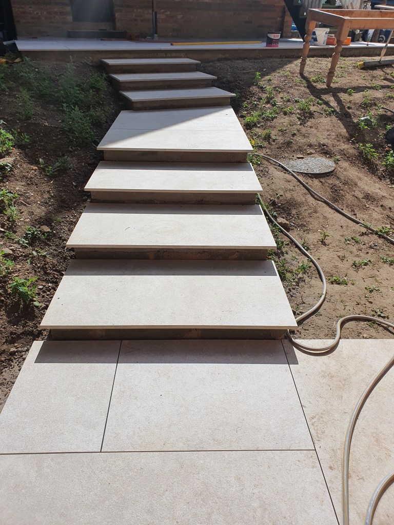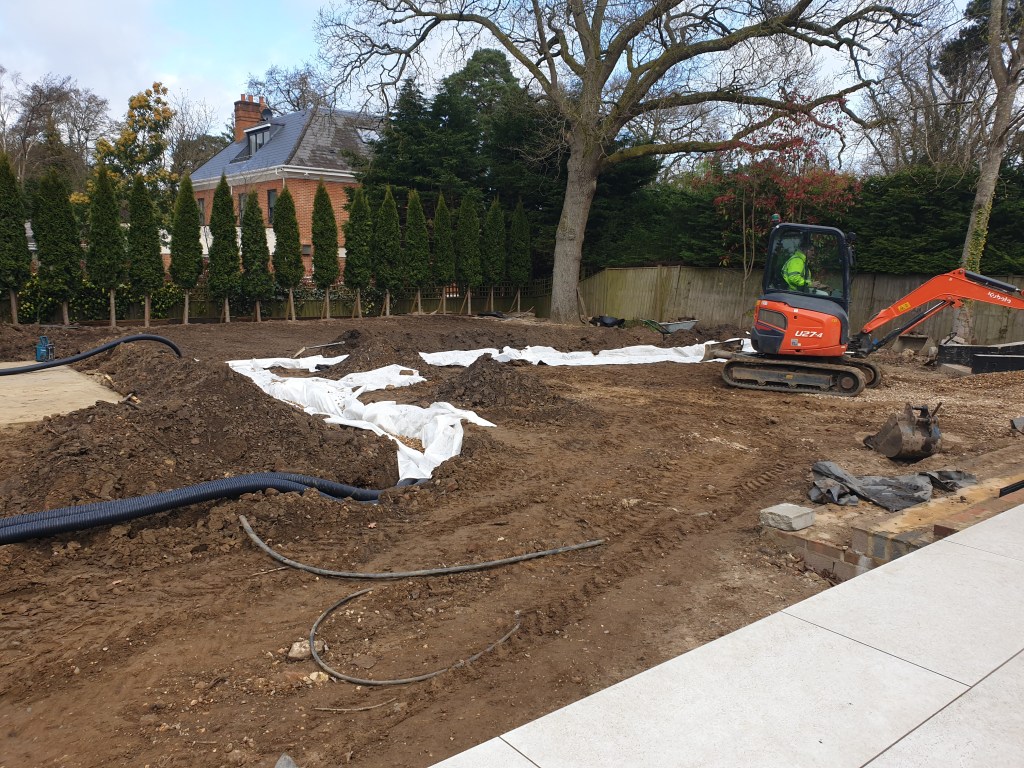 Ascot-landscaping, new garden design, stone patio, oak railway slippers walls and stairs, turfing and led lighting